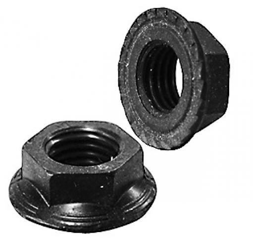 DIN 6923 Гайка шестигранная с фланцем, диаметр резьбы от М4 до М20, аналоги EN 1661, ISO 4161. Фланец гайки имеет плоскую поверхность. Для стопорения крепёжного соединения нижняя часть фланца может изготавливаться с насечками.